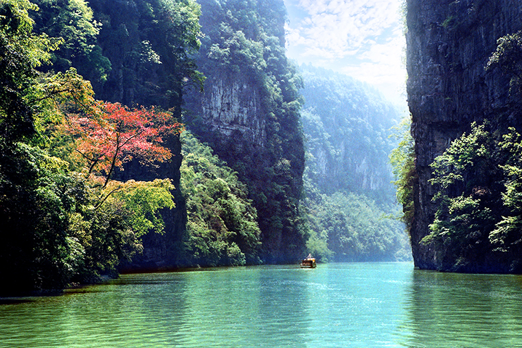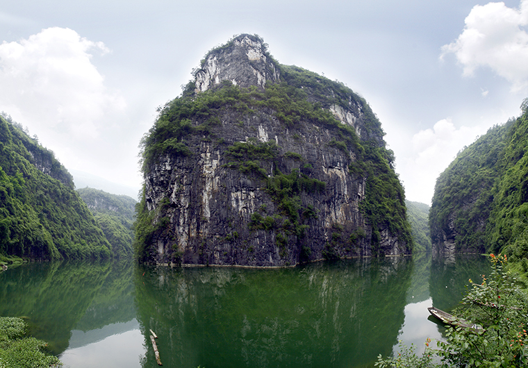 神龜峽是阿蓬江峽谷景觀中最為優越的河段,從黔江兩河鎮至酉陽大河口,全長38.9公里。峽口緊鄰國道319線,距黔江城44公里。神龜峽水深數十米,兩岸山高50多米,沿途懸崖峭壁,突兀奇峰,兩岸風光原始古樸,美不勝收,優于大寧河,勝于小三峽,是度假休閑的好地方。 神龜峽河水迂回曲折,山高水深,全程有27個彎,有神門天門、 人門等28個門: 水繞山轉,蜿蜓盤曲,其彎道之多,實屬峽谷罕見。真可謂“船到崖前疑天路,調轉船頭又一彎”。在沿峽谷而下的途中,有多達20余處別開生面的自然景觀,在其中有“三龍搶寶”, “天橋”,“寶頂”,“美女峰”、 “紅巖”等美景,各具風采,猶如一神龜峽幕幕精彩而美麗的畫卷,讓人目不暇接,大飽眼福。