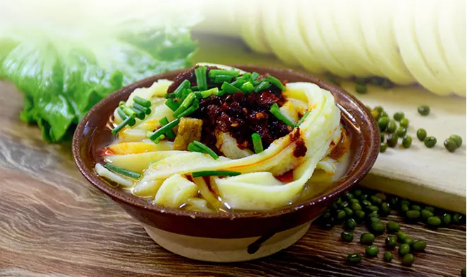 綠豆性涼味甘,有清熱解毒、止渴消暑、利尿潤膚的功效。濯水綠豆粉用大米和綠豆為主要原料磨成漿,再用漏..